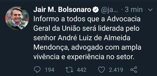 Bolsonaro nomeia novo Advogado Geral da União